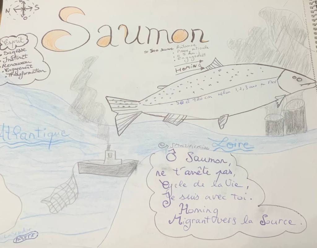 Dessin issu d’un journal naturaliste sur le Saumon, réalisé en mai 2023.